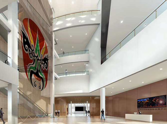 淮州新城國(guó)際會(huì)展中心采用圓形作為基本形體,通過(guò)透明玻璃幕墻從底部托起,營(yíng)造出建筑整體懸浮半空的姿態(tài),形似“UFO”飛行器。主要分為展覽中心、會(huì)議中心、航空博物館和設(shè)備用房及庫(kù)房等輔助功能區(qū)三部分功能分區(qū)。一層為展廳,服務(wù)于未來(lái)航空產(chǎn)業(yè)產(chǎn)品的展覽,二三層為會(huì)議功能區(qū),服務(wù)于大型航空產(chǎn)業(yè)會(huì)議的召開(kāi),四層為航天博物館。未來(lái),淮州新城國(guó)際會(huì)展中心將成為淮州新城通用航空產(chǎn)業(yè)對(duì)外展示的窗口。