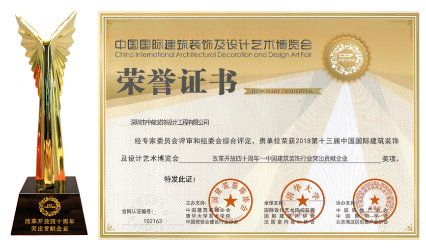 ? ? ??近日,由中國建筑裝飾協(xié)會與清華大學(xué)美術(shù)學(xué)院聯(lián)合主辦的第十三屆中國國際建筑裝飾及設(shè)計藝術(shù)博覽會在北京國際會議中心舉行,在本次博覽會上,中航裝飾被授予“改革開放四十周年~中國建筑裝飾行業(yè)突出貢獻企業(yè)”稱號,中航裝飾集團石英董事長被評為“改革開放四十周年~中國建筑裝飾行業(yè)突出貢獻企業(yè)家”。
