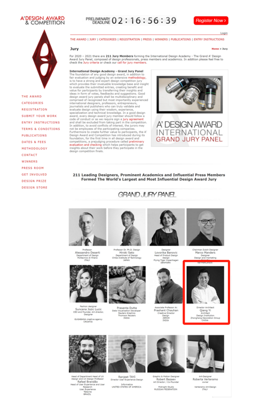 ? ? ? ?多年來他受邀擔(dān)任意大利A Design Award 設(shè)計大獎|國際評審、中國百強(qiáng)H.Design酒店設(shè)計大賽專家評審、中國建筑學(xué)會室內(nèi)設(shè)計獎|專業(yè)評委、深圳市住建局政府特聘|專家評委、中國未來空間設(shè)計大賽尋星獎|專家評委、中國祝融獎總決賽|專業(yè)評委等多個設(shè)計大賽的專業(yè)評審,其中2019至2023年連續(xù)五年受邀意大利A設(shè)計獎?chuàng)谓ㄖc室內(nèi)單元國際評委。
