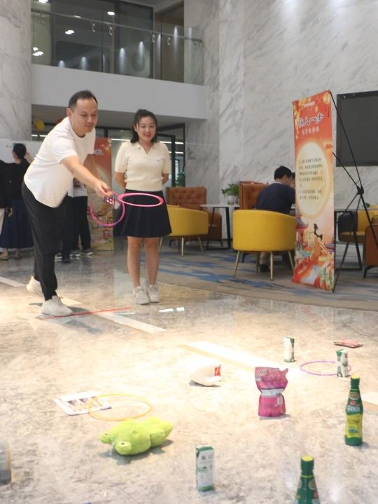 在“玉兔套圈”的游戲環節,參與者手持圈環,目標便是前方擺放的物品。游戲看似簡單,卻需要精準的技巧和良好的手眼協調能力。員工們爭相挑戰,歡聲笑語充滿了整個場地。